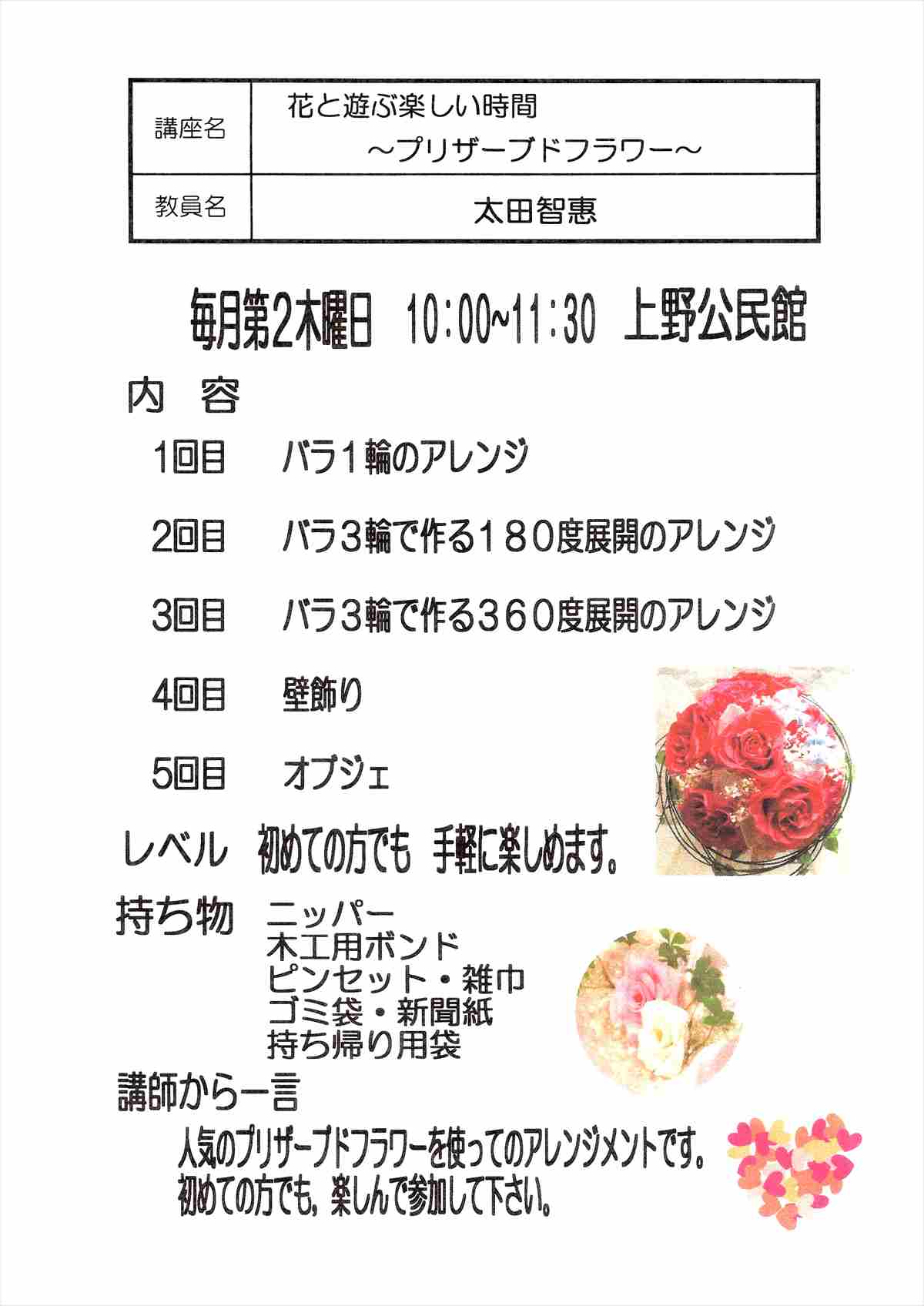 | 200 | 花と遊ぶ楽しい時間 ~プリザーブドフラワー~ | 太田智惠 | 4/9・5/14・6/11・7/9・9/10 | 木 | 10:00~11:30 | 上公 | 5 | ABC | ¥11,000 | 15 |