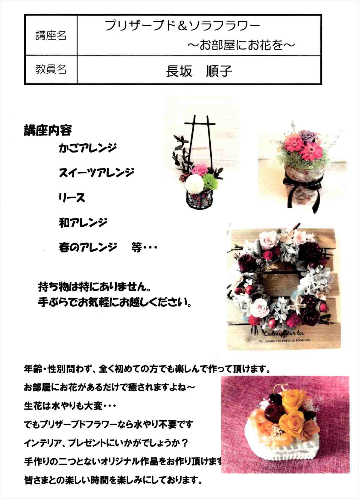 | 201 | プリザーブド&ソラフラワー ~お部屋にお花を~ | 長坂順子 | 土 | 14:00~15:30 | 横図 | 5 | AB | ¥11,000 | 10 | |