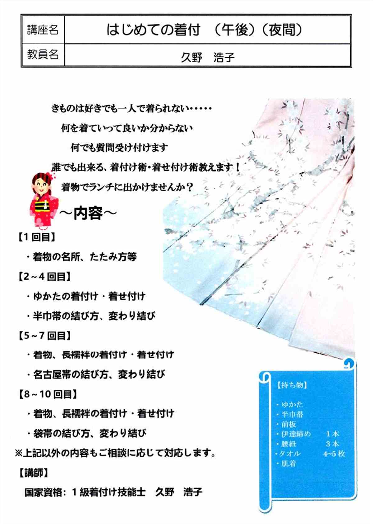 | 203 | はじめての着付 (夜間) | 久野浩子 | 4/8・4/22・5/13・5/27・6/10・6/24・7/8・7/29・8/26・9/9 | 水 | 18:30~20:30 | 芸劇 | 10 | ABC | ¥0 | 15 |