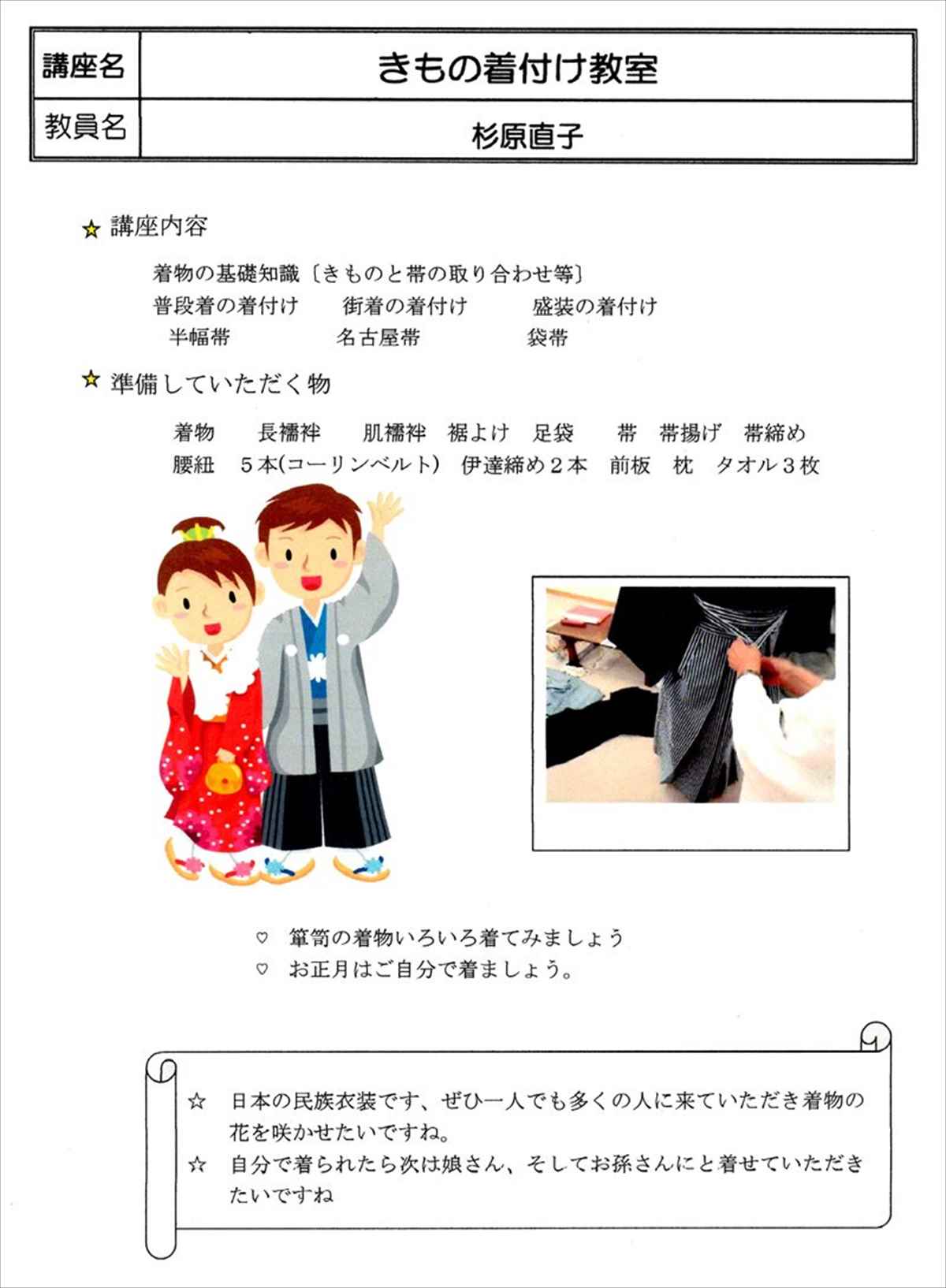 | 204 | きもの着付け教室 (第1・3) | 杉原直子 | 4/17・5/15・6/5・6/19・7/3・7/17・8/7・8/21・9/4・9/18 | 金 | 10:00~11:30 | 上公 | 10 | ABC | ¥0 | 16 |