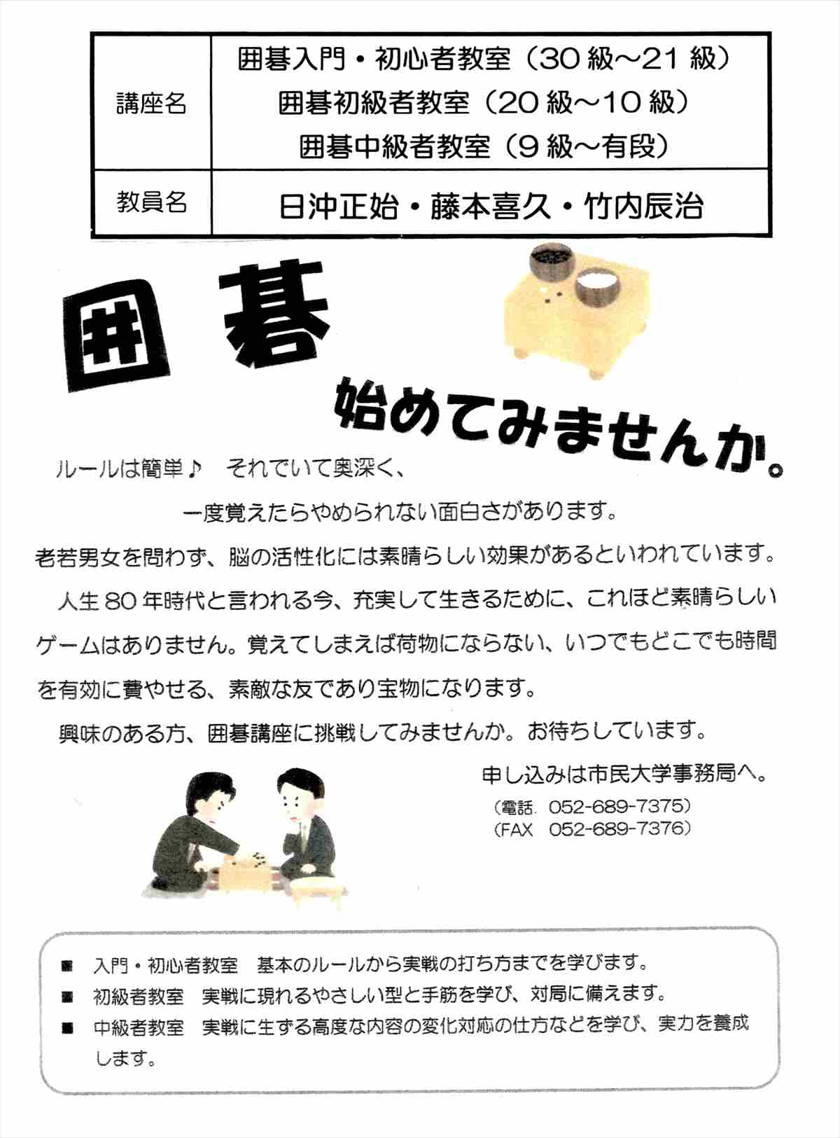 | 207 | 囲碁入門・初心者教室(30級~21級) | 日沖正始 藤本喜久 |