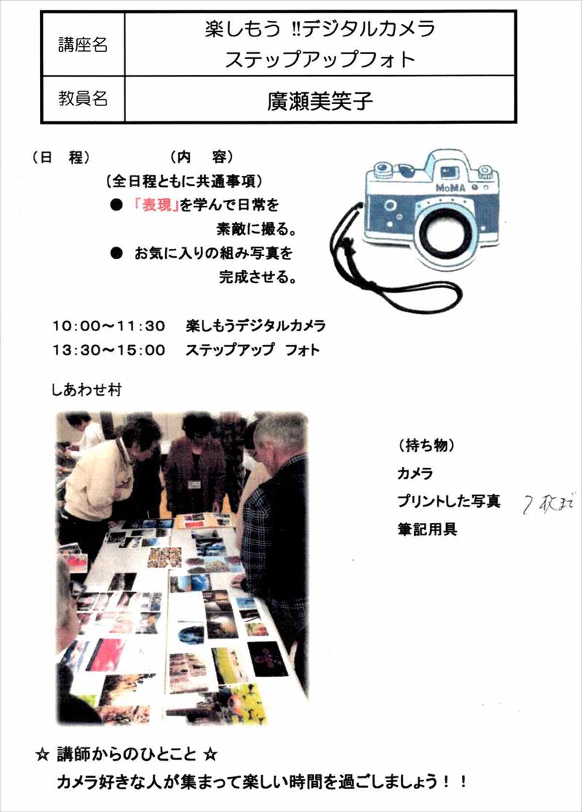 | 211 | ステップアップフォト | 廣瀬美笑子 | 4/10・5/1・7/3・8/7・9/4 | 金 | 13:30~15:00 | し村 | 5 | ABC | ¥300 | 20 |