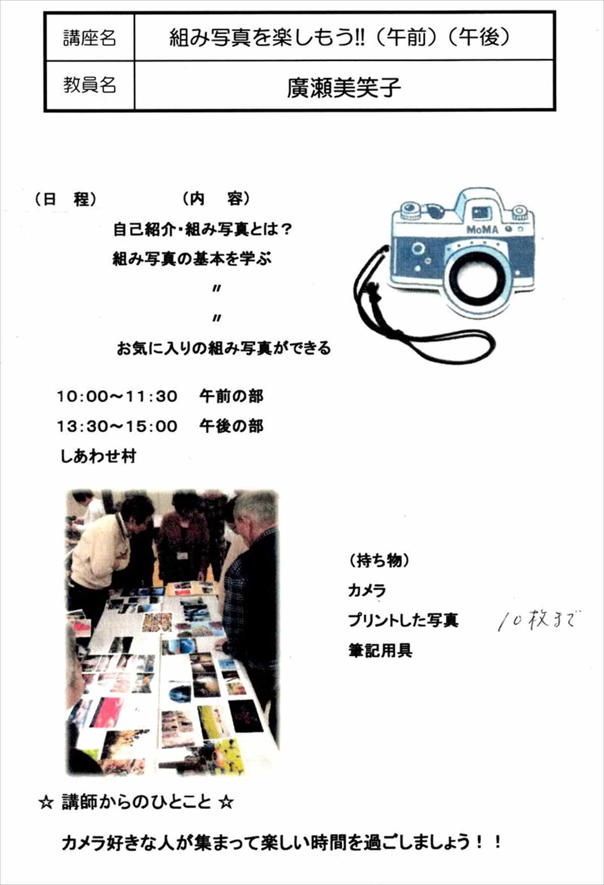 | 213 | 組み写真を楽しもう!!(午後) | 廣瀬美笑子 | 4/17・5/15・6/19・7/17・9/18 | 金 | 13:30~15:00 | し村 | 5 | ABC | ¥300 | 20 |
