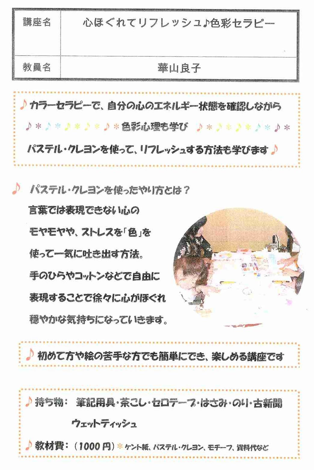 | 217 | 心ほぐれてリフレッシュ♪色彩セラピー | 華山良子 | 4/16・5/21・6/18・8/20・9/17 | 木 | 13:30~15:00 | し村 | 5 | AB | ¥1,000 | 16 |