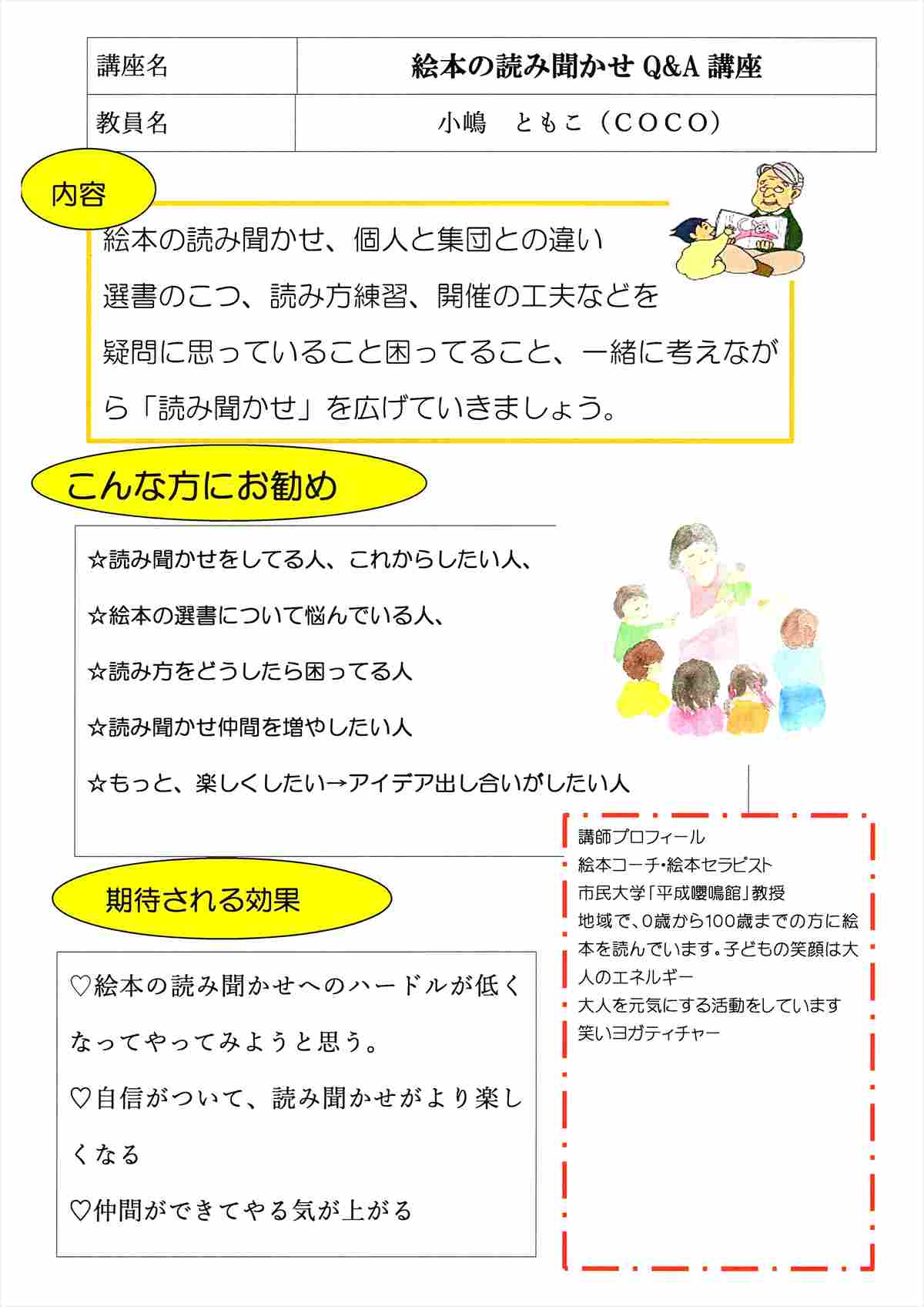 | 219 | 絵本の読み聞かせQ&A 講座 | 小嶋ともこ | 4/8・5/13・6/10・7/8・8/12 | 水 | 10:00~11:30 | 上公 | 5 | ABC | ¥500 | 20 |