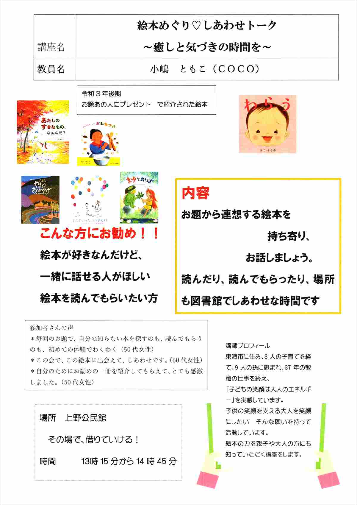| 220 | 絵本めぐり♥しあわせトーク | 小嶋ともこ | 4/8・5/13・6/10・7/8・8/12 | 水 | 13:15~14:45 | 上公 | 5 | ABC | ¥500 | 20 |