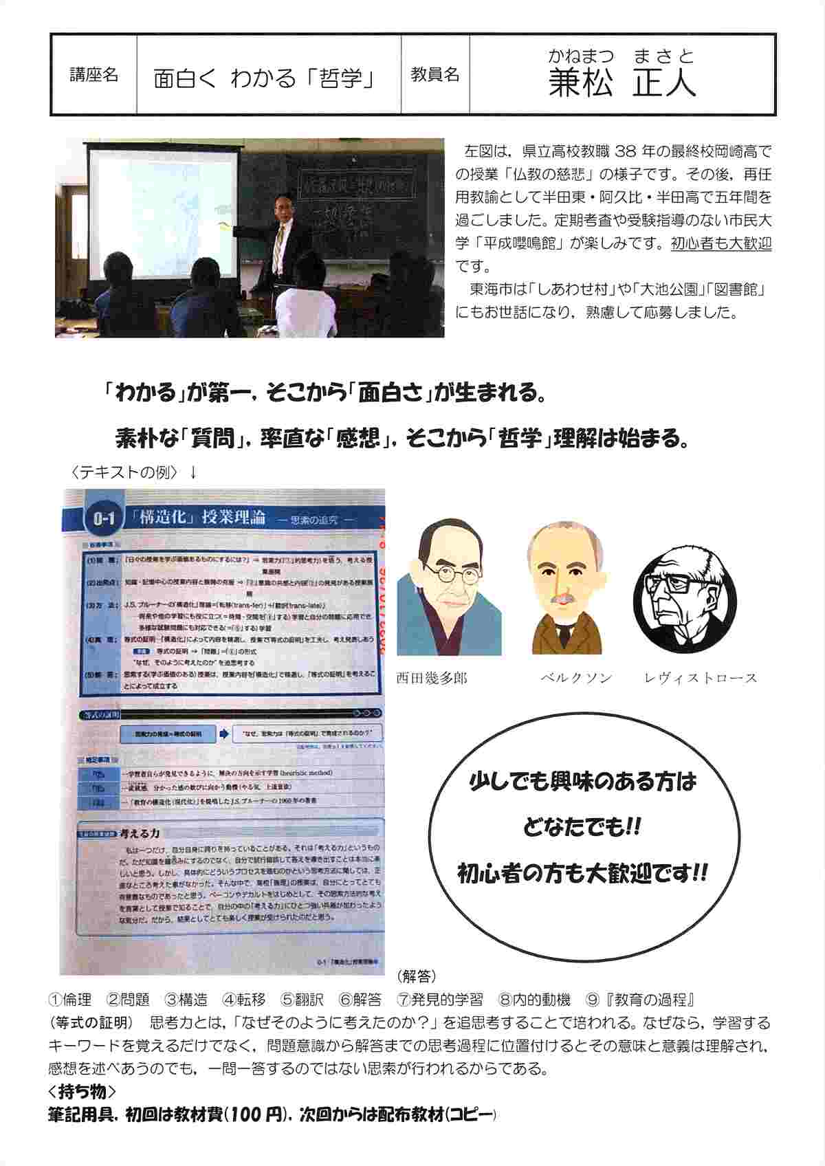 | ★221 | 面白くわかる「哲学」 | 兼松正人 | 4/7・4/21・5/19・6/2・6/16 | 火 | 10:00~11:30 | 上公 | 5 | ABC | ¥100 | 20 |