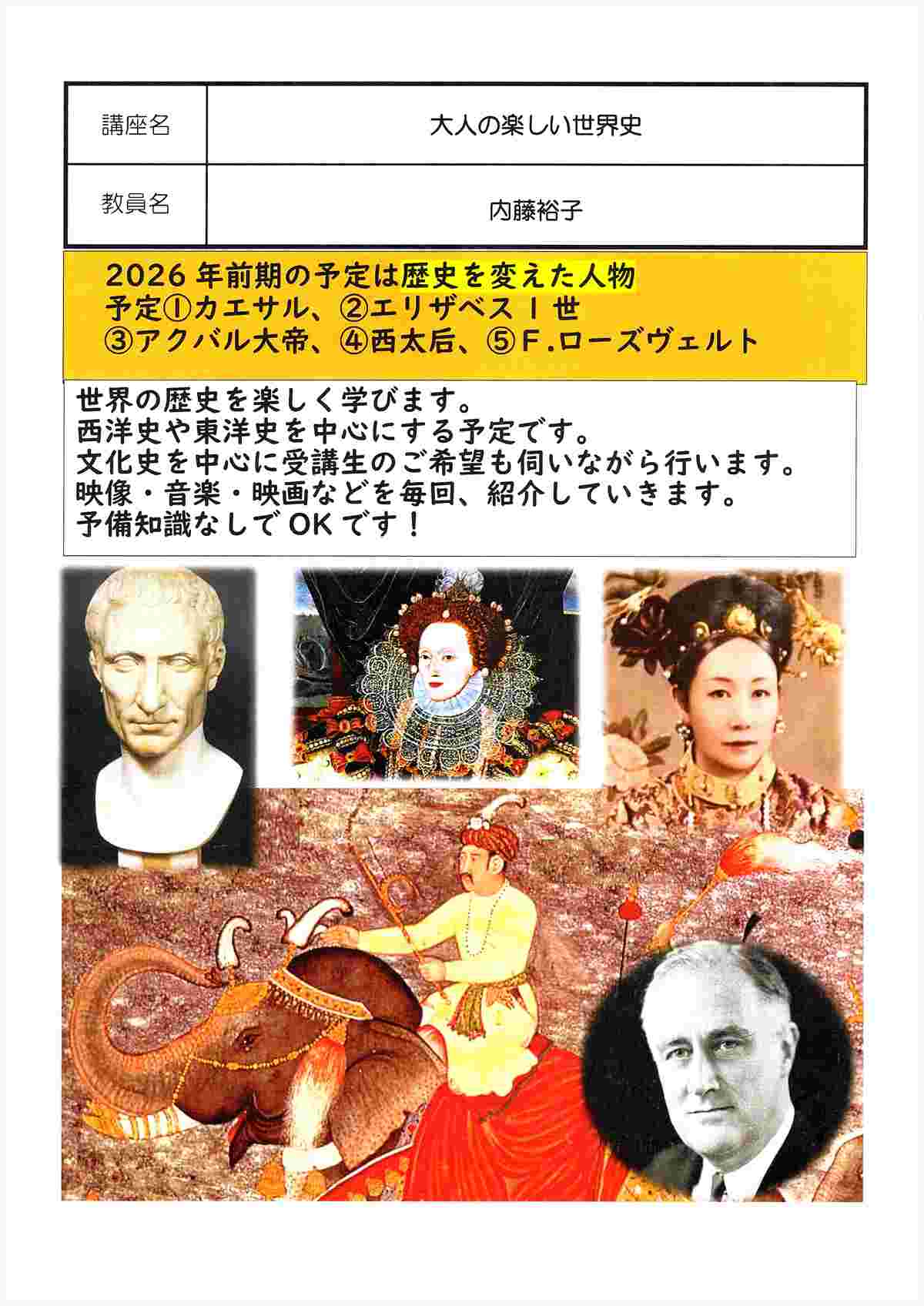 | 222 | 大人の楽しい世界史 | 内藤裕子 | 4/11・5/9・6/13・7/11・8/1 | 土 | 10:00~11:30 | 勤セ | 5 | A | ¥350 | 30 |