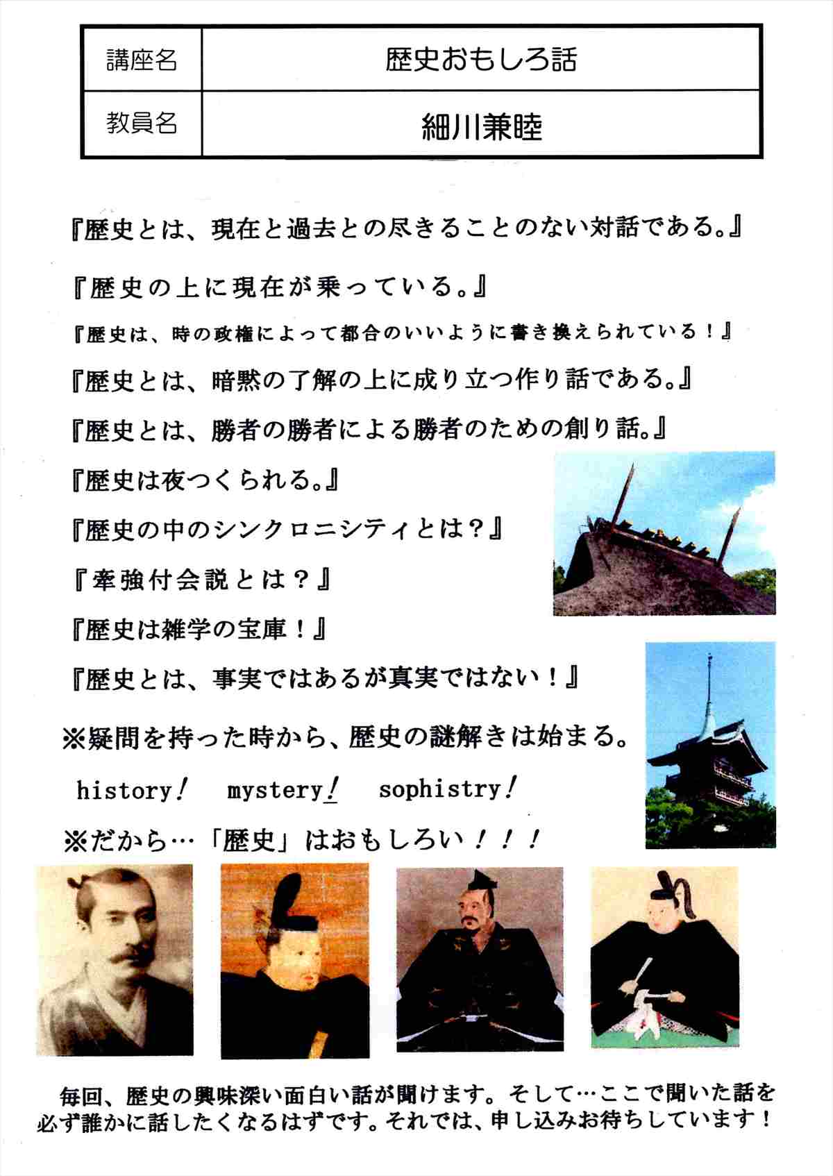 | 223 | 歴史おもしろ話 | 細川兼睦 | 4/15・5/13・6/10・7/8・7/29 | 水 | 14:00~15:30 | 勤セ | 5 | ABC | ¥300 | 30 |
