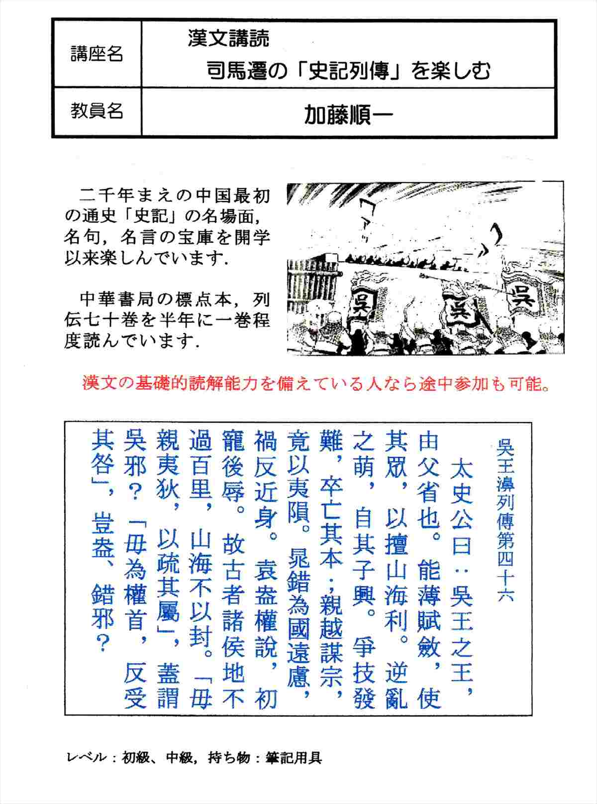 | 224 | 漢文講読 司馬遷の「史記列傳」を楽しむ | 加藤順一 | 4/15・5/20・6/3・6/17・7/1・7/15・8/5・8/19・9/2・9/16 | 水 | 13:30~15:00 | 上公 | 10 | BC | ¥13,000 | 10 |