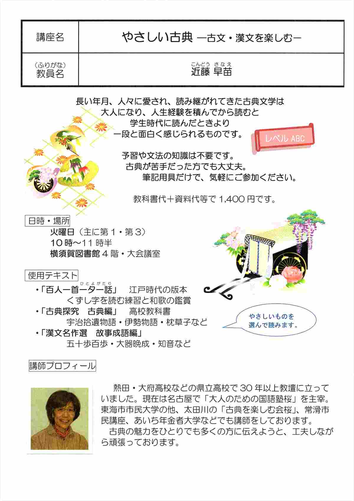 | 225 | やさしい古典 -古文・漢文を楽しむ- | 近藤早苗 | 4/7・4/21・5/19・6/2・6/16・7/7・8/4・8/18・9/1・9/15 | 火 | 10:00~11:30 | 横図 | 10 | ABC | ¥1,400 | 50 |