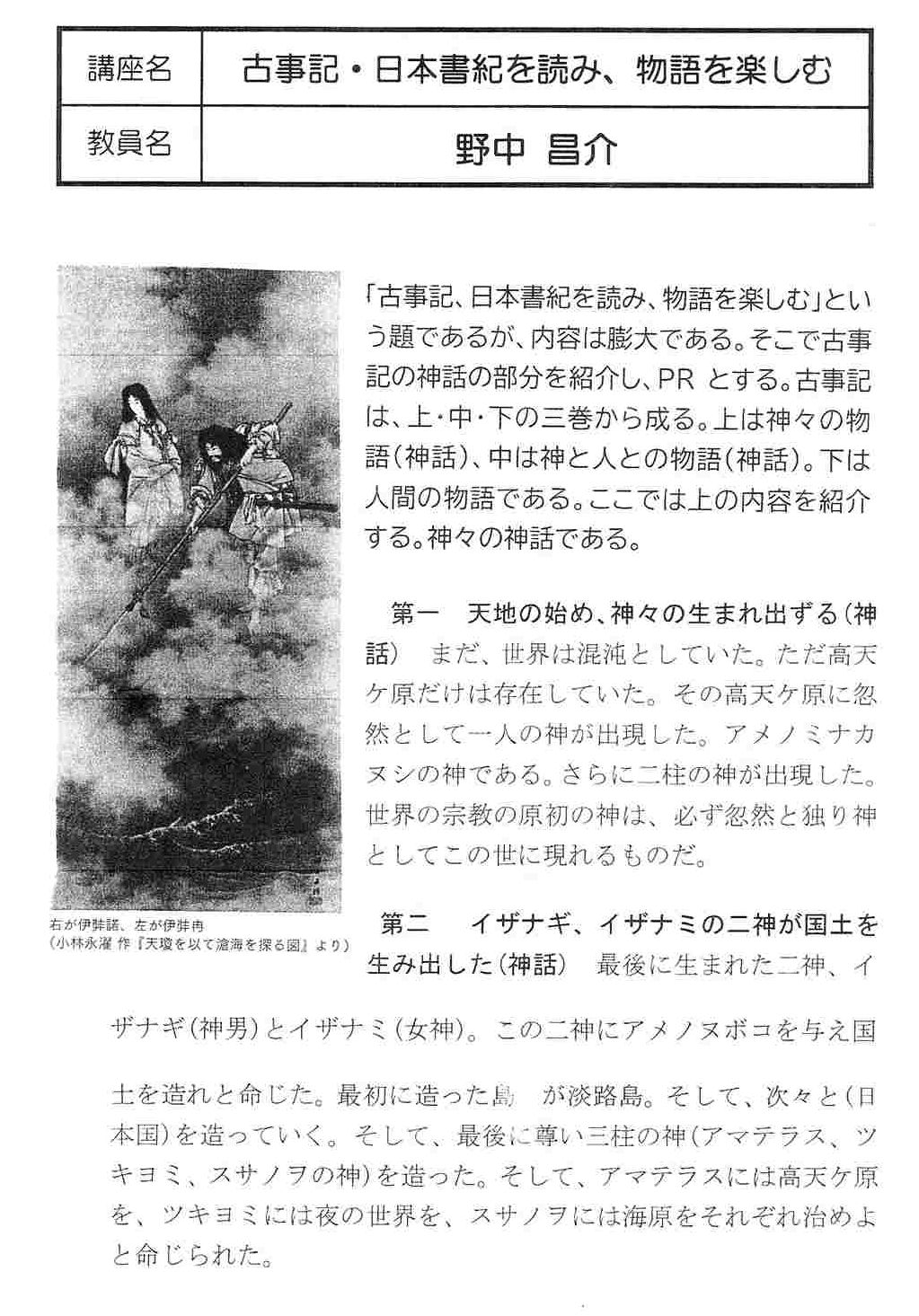 | 226 | 古事記・日本書紀を読み、物語を楽しむ | 野中昌介 | 4/17・5/1・5/15・6/5・6/19・7/3・7/17・8/7・8/21・9/4 | 金 | 13:30~15:00 | 横図 | 10 | ABC | ¥700 | 20 |
