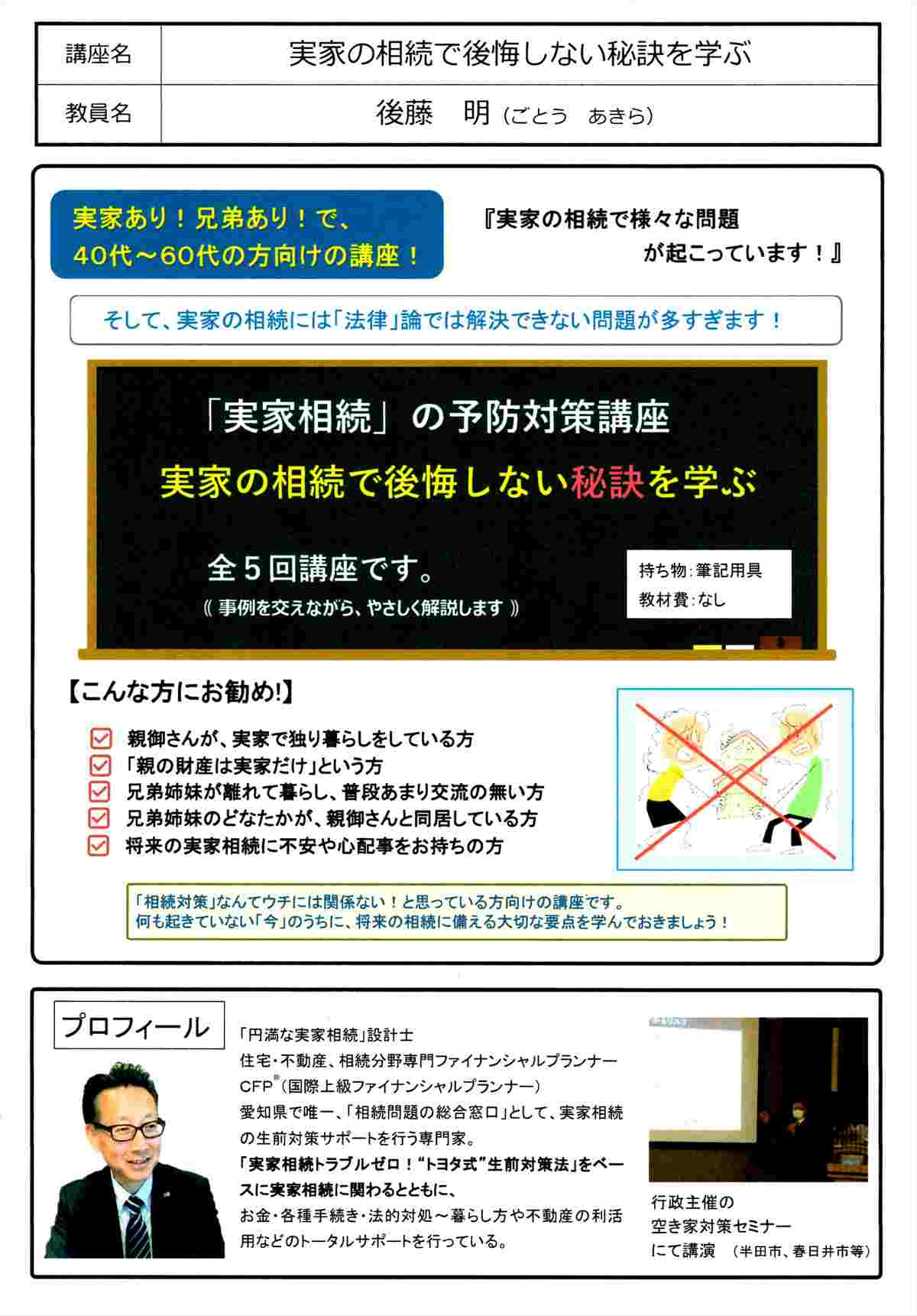 | 227 | 実家の相続で後悔しない秘訣を学ぶ | 後藤 明 | 5/15・5/22・5/29・6/5・6/12 | 金 | 19:00~20:30 | 上公 | 5 | A | ¥0 | 20 |