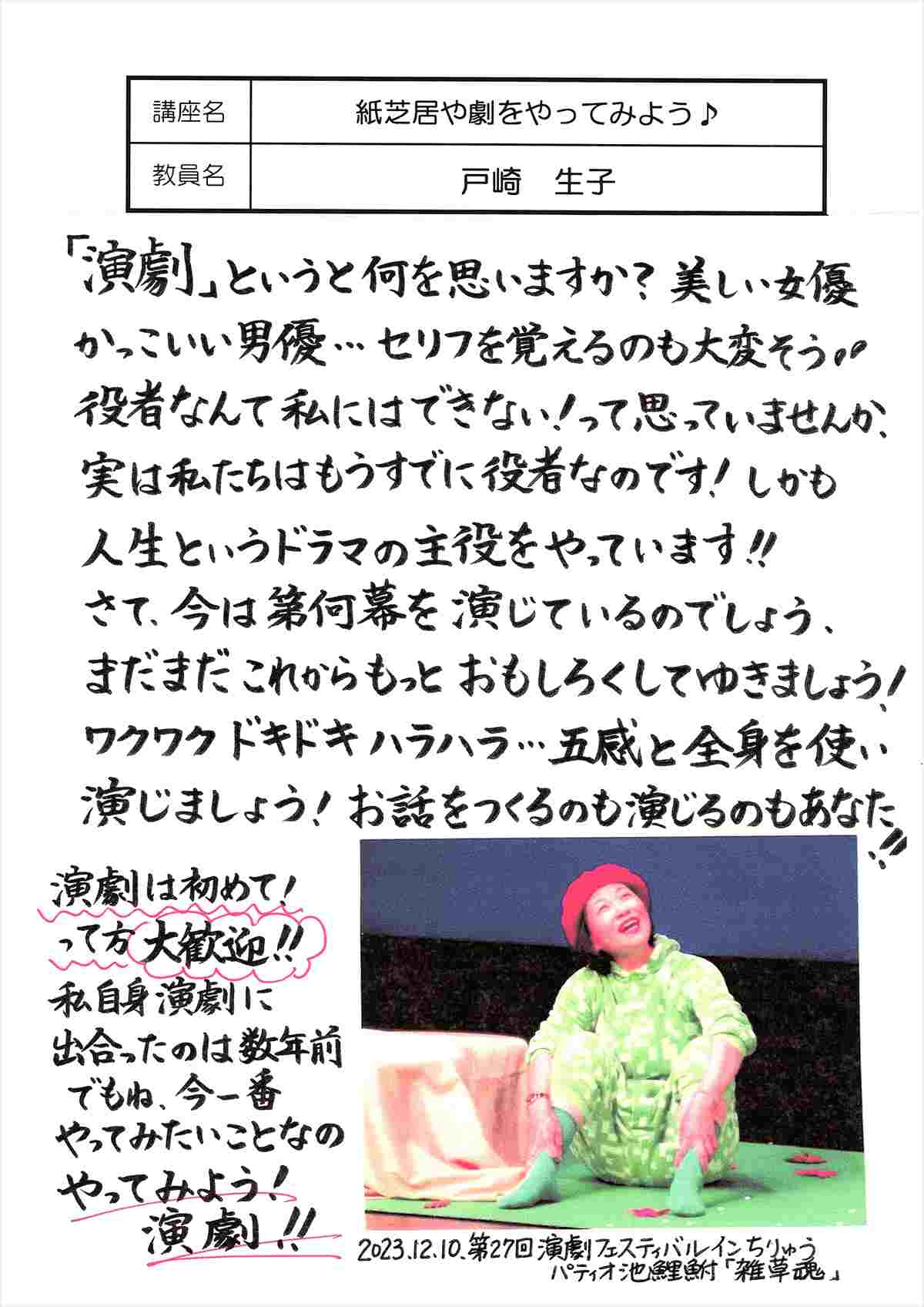 | 228 | 紙芝居や劇をやってみよう♪ | 戸崎生子 | 7/15・8/19・9/2・9/9・9/16 | 水 | 13:00~14:30 | 芸劇 | 5 | A | ¥2,000 | 20 |