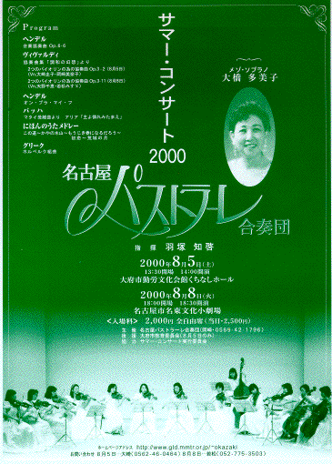 名古屋パストラーレ合奏団では、この8月に「サマー・コンサート2000」を、下記の2会場において開催いたしました。 今回はゲストにメゾ・ソプラノの大橋多美子さんをお迎えし、バツハ宗教音楽の最高峰「マタイ受難曲」のアリアや、ヘンデルの「オンブラ・マイ・フ」(